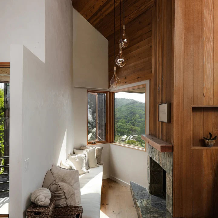 Lampes en verre industriel, lumière transparente, élégance esthétique espaces montagneux.